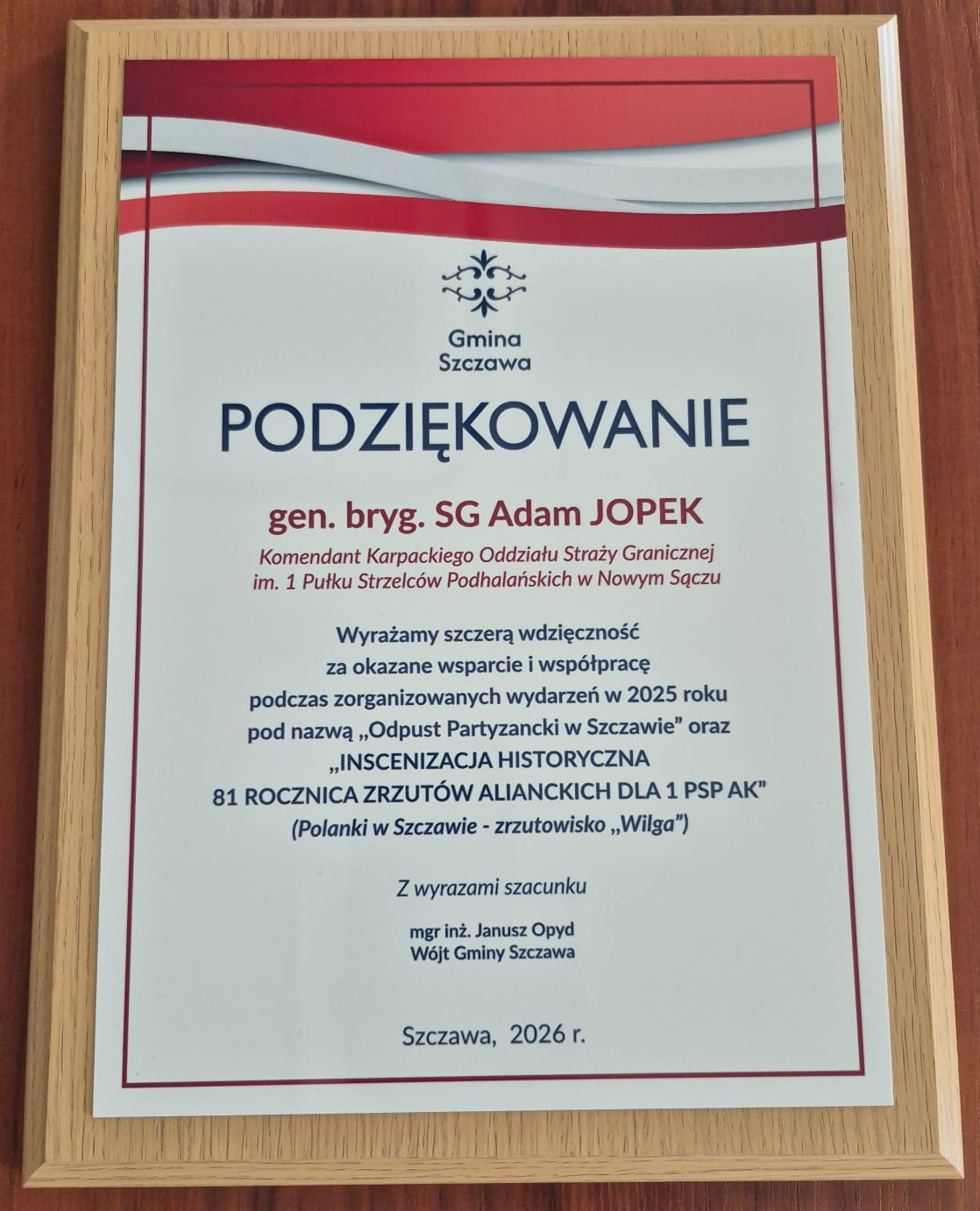 Wójt Gminy Szczawa Janusz Opyd wraz z Dyrektorem Gminnego Centrum Dziedzictwa Kulturowego i Biblioteki Publicznej w Szczawie Iwoną Kuzak– Stachowicz oraz Dyrektorem Delegatury Małopolskiego Urzędu Wojewódzkiego w Nowym Sączu Urszulą Sroką, byli gośćmi Karpackiego Oddziału SG w Nowym Sączu. Na ręce Komendanta Oddziału gen. bryg. SG Adama Jopka trafiły podziękowania za nieocenioną pomoc w organizacji oraz uświetnieniu obchodów 81. rocznicy zrzutów alianckich dla 1 Pułku Strzelców Podhalańskich Armii Krajowej.