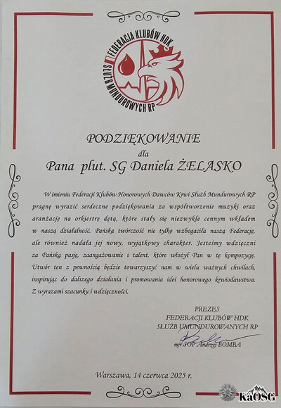 Koncert dyplomowy plut. SG Daniela Żelasko był nie tylko zwieńczeniem kilkuletniej pracy artystycznej i edukacyjnej, lecz także potwierdzeniem jego wysokich kompetencji dyrygenckich. Występ pokazał go jako dojrzałego muzyka, który z powodzeniem łączy służbę w Straży Granicznej z aktywną działalnością artystyczną na rzecz rozwoju i popularyzacji orkiestr dętych. W czerwcu bieżącego roku czeka go jeszcze ostateczny koncert dyplomowy, który odbędzie się w Filharmonii Krakowskiej im. Karola Szymanowskiego i będzie symbolicznym zwieńczeniem jego studiów dyrygenckich.