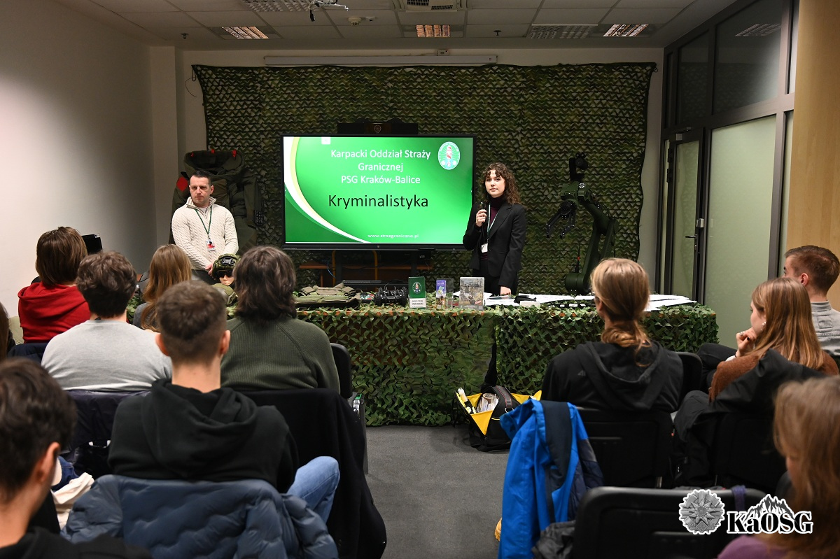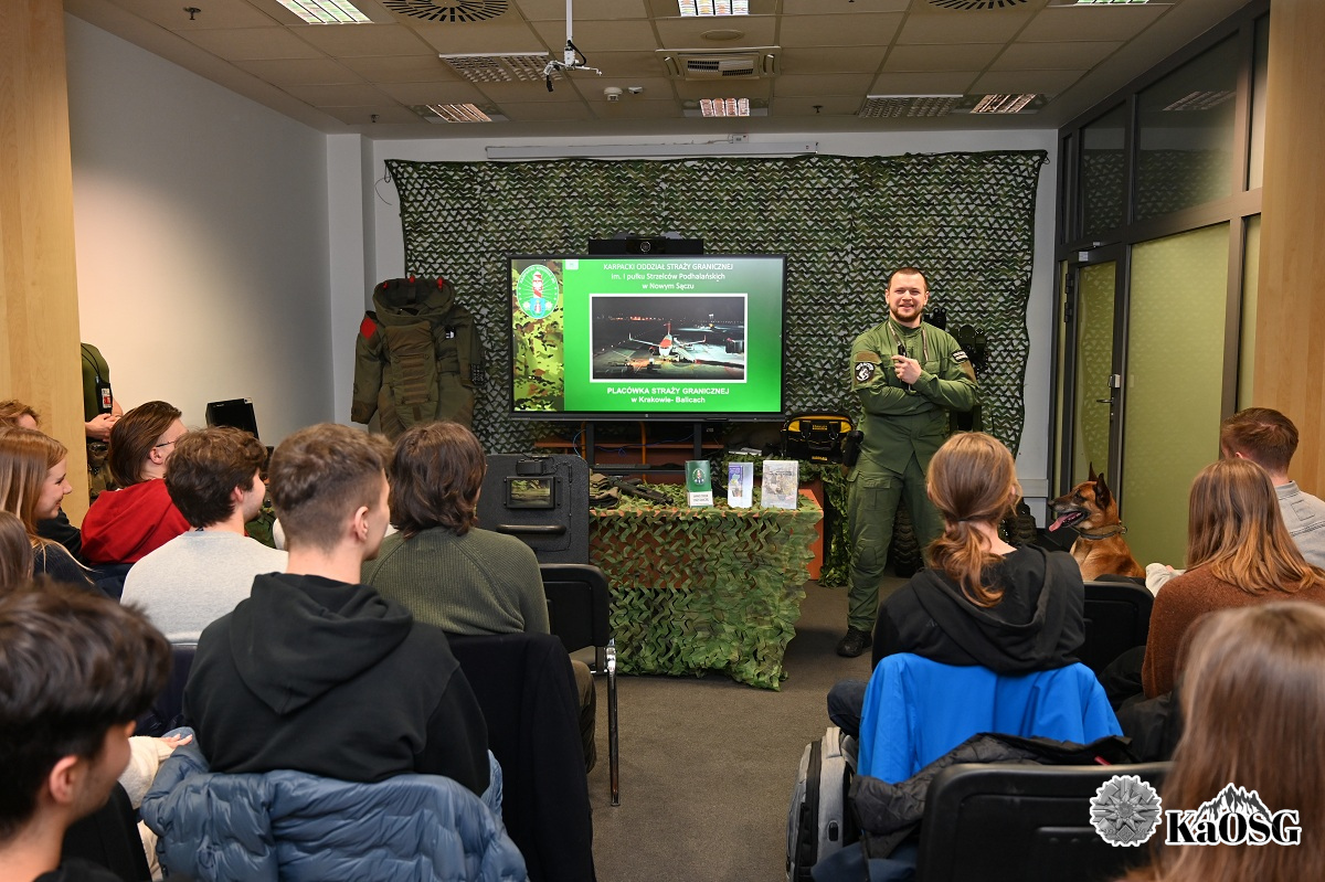 Studenci w trakcie spotkania mogli zapoznać się ze specyfiką służby pełnionej przez funkcjonariuszy w przejściu lotniczym w Krakowie – Balicach. Przedstawiono charakter i rodzaj wykonywanych czynności służbowych realizowanych przez funkcjonariuszy Zespołu Kontroli Ruchu Granicznego, Zespołu Nadzoru nad Kontrolą Bezpieczeństwa, Zespołu Interwencji Specjalnych oraz przewodnika psa służbowego w Straży Granicznej.