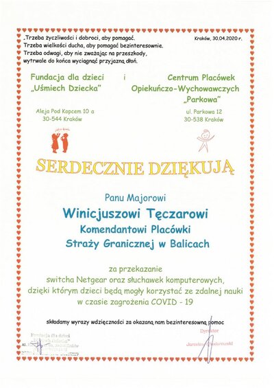 W Placówce SG w Krakowie – Balicach, z zachowaniem wszelkich zasad higieny i ostrożności przeprowadzono specjalną akcję. Zebrano środki finansowe, za które zakupiony został sprzęt teleinformatyczny, niezbędny dzieciom do nauki zdalnej, wprowadzonej w związku z panującym obecnie stanem epidemii COVID-2019.