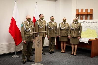 Następnie w siedzibie nowo utworzonej Placówki SG w Krakowie odbyło się oficjalne wprowadzenie na stanowisko Komendanta mjr. SG Grzegorza OTRĘBY. W spotkaniu wzięła udział kadra kierownicza KaOSG, Komendant Placówki SG w Krakowie - Balicach oraz funkcjonariusze i pracownicy Placówki SG w Krakowie.