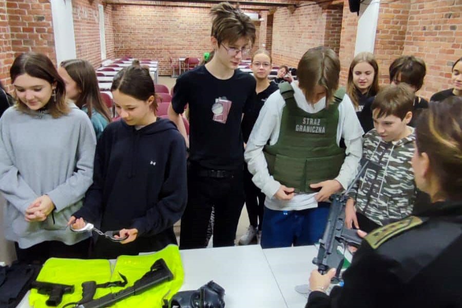 Piątkowy wykład dotyczący zagadnień związanych z codzienną służbą w Straży Granicznej młodzież przyjęła z ogromnym zainteresowaniem. Podczas spotkania uczestnicy dowiedzieli się między innymi jak wyglądają ogólne warunki służby w formacji. Zaprezentowano również wyposażenie funkcjonariuszy Straży Granicznej, jakim na co dzień podczas służby się posługują. Podczas prelekcji omówione zostały także kwestie warunków, jakie trzeba spełniać, aby poruszać się po świecie, czy przekraczać granice państw.