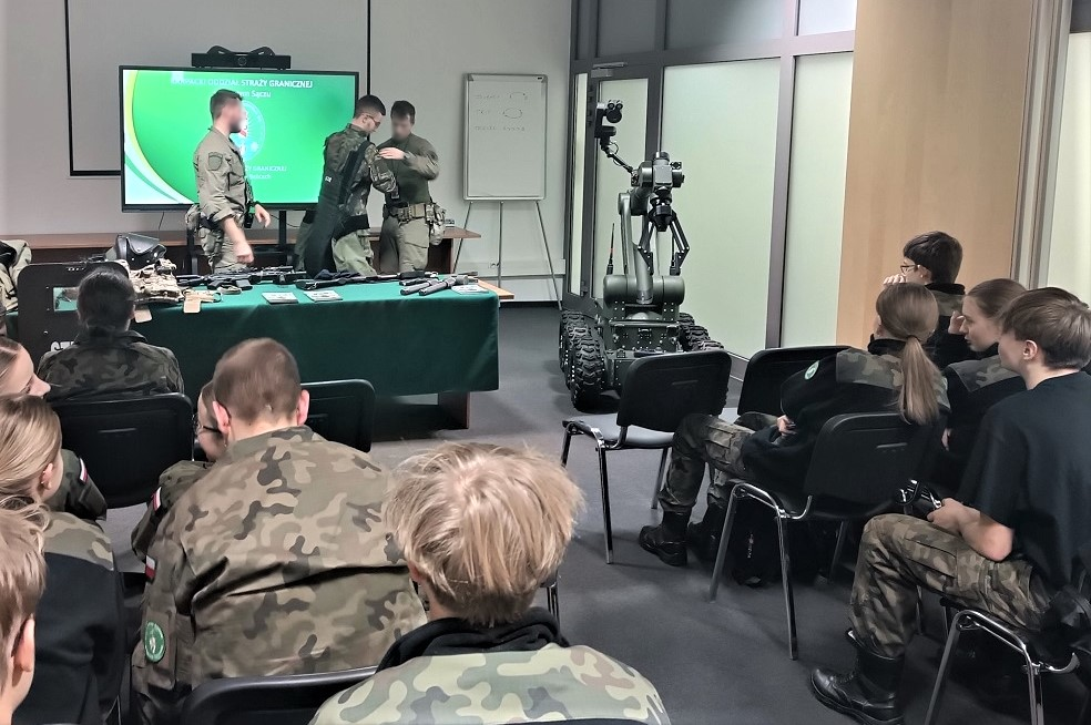 Pod koniec listopada na terenie Placówki Straży Granicznej w Krakowie - Balicach funkcjonariusze spotkali się z uczniami klas drugich o profilu Straż Graniczna ze szkół patronackich: I Liceum Ogólnokształcącego im. Tadeusza Kościuszki w Dąbrowie Tarnowskiej oraz Liceum Ogólnokształcącego Zespołu Szkół im. Świętej Jadwigi Królowej w Żegocinie.