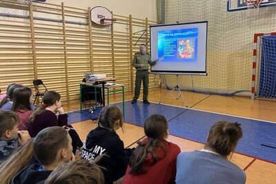 Chor. szt. SG Zbigniew Krzysztofek - funkcjonariusz z Placówki Straży Granicznej w Zakopanem przeprowadził prelekcję dla uczniów Szkoły Podstawowej w Rokicinach Podhalańskich.